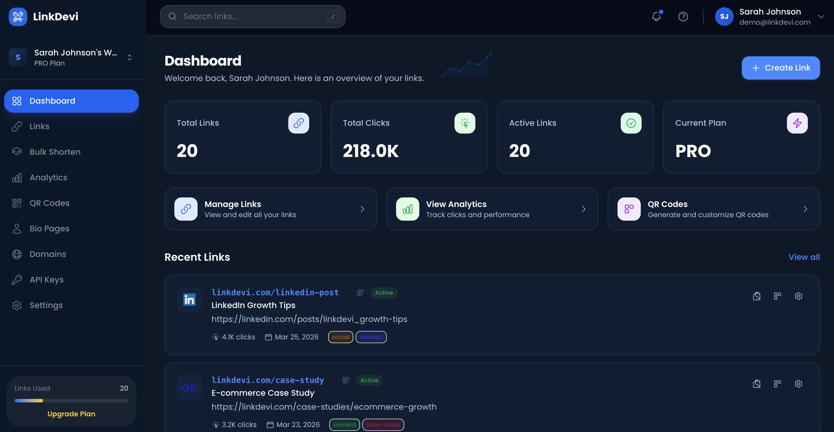 Beyond basic link shortening, LinkDevi includes custom domain support so your short links use your own brand, QR code generation with scan tracking, bio pages for social media profiles, password-protected links, bulk URL shortening, and a full REST API for developers. All of this is available from a single platform with no ads and no hidden fees.